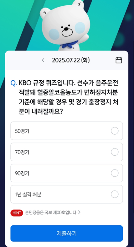 💬 “KBO 규정에 따라 음주운전 적발 시 몇 경기 출전정지 처분이 내려질까요?”