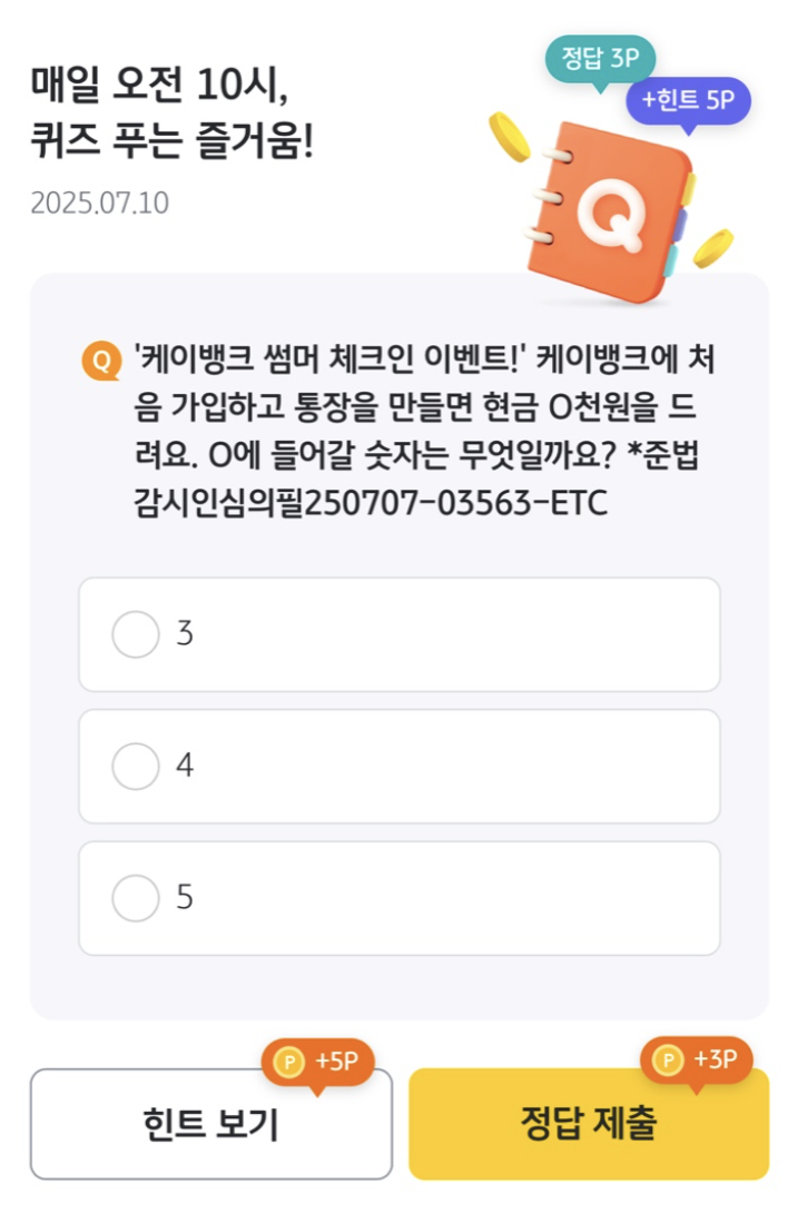 | ❓ 문제 내용 | 케이뱅크 썸머 체크인 이벤트 현금 지급 ‘O천원’ 자리 숫자 |