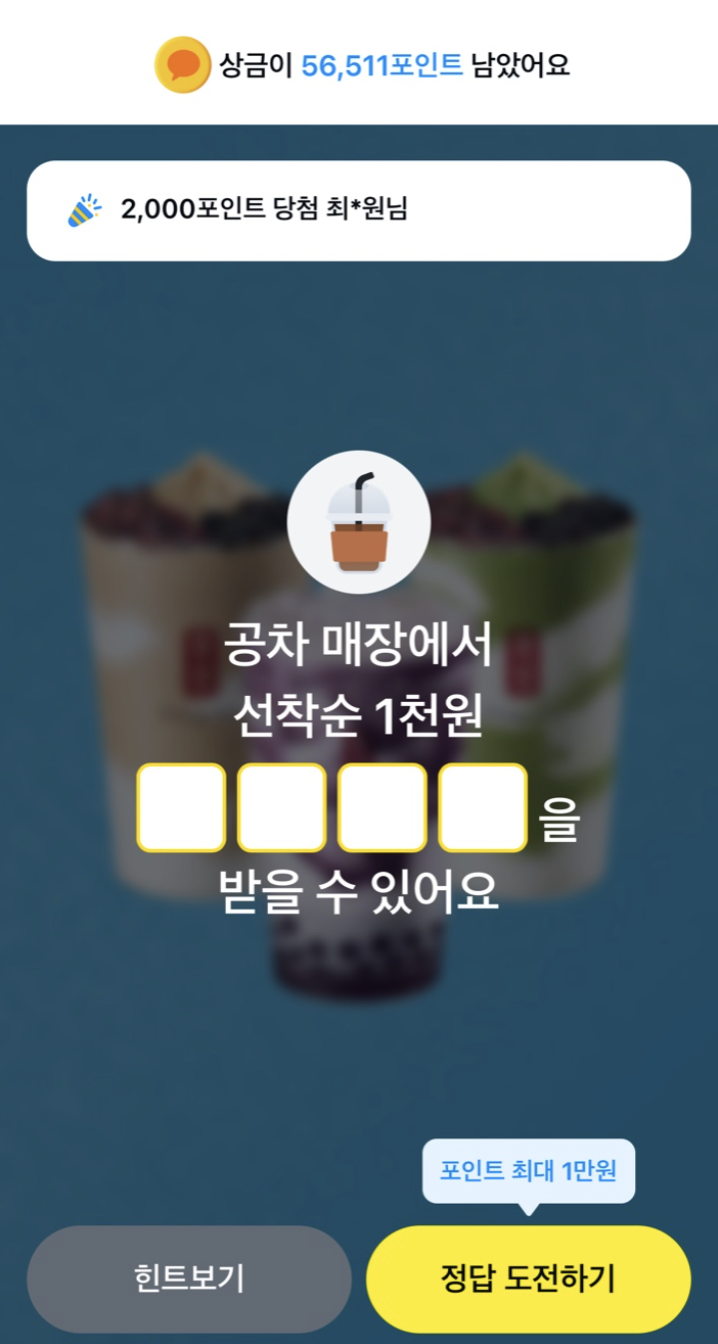 | ❓ 문제 | 공차 매장에서 선착순 1천원 □□□□을 받을 수 있어요 |