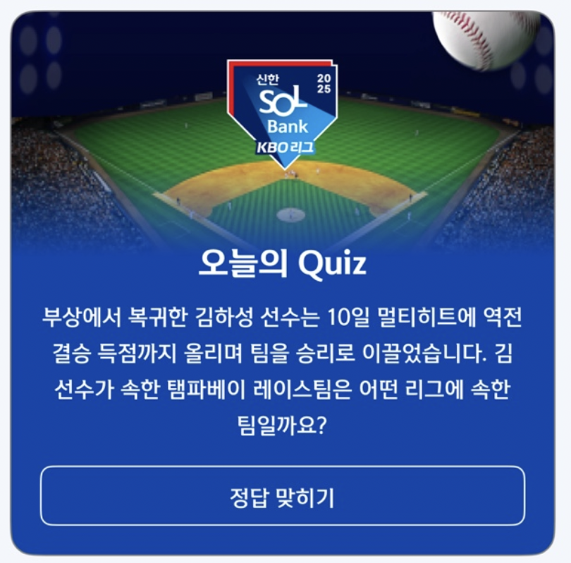 오늘의 정답 아메리칸 리그 입력하셨나요? 쏠퀴즈는 1분도 안 걸리는 간단한 참여로 랜덤 포인트 챙길 수 있는 좋은 루틴입니다.